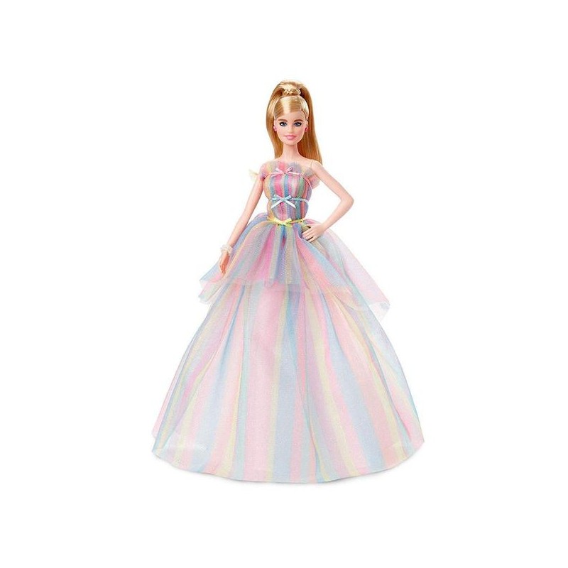 ¡Feliz cumpleaños! Por fin ha llegado su día especial, y la muñeca Barbie® de Birthday Wishes ™ se complace en unirse a su celebración. Esta muñeca coleccionable de Barbie® es dulzura, arcoiris y todo lo que hace que los cumpleaños sean especiales. Ella usa un vestido a rayas de arcoíris con capas brillantes de múltiples niveles y delicados detalles de lazo para cualquier celebración. El paquete incluye espacio para escribir un mensaje personalizado, lo que convierte a la muñeca Barbie® de Birthday Wishes ™ en el regalo perfecto para el día especial de alguien. ¡Sopla tus velas y pide un maravilloso año por venir! Incluye soporte para muñecas y certificado de autenticidad. Sujeto a disponibilidad. Los colores y las decoraciones pueden variar. ¡La muñeca Barbie® de Birthday Wishes ™ se complace en unirse a tu celebración!