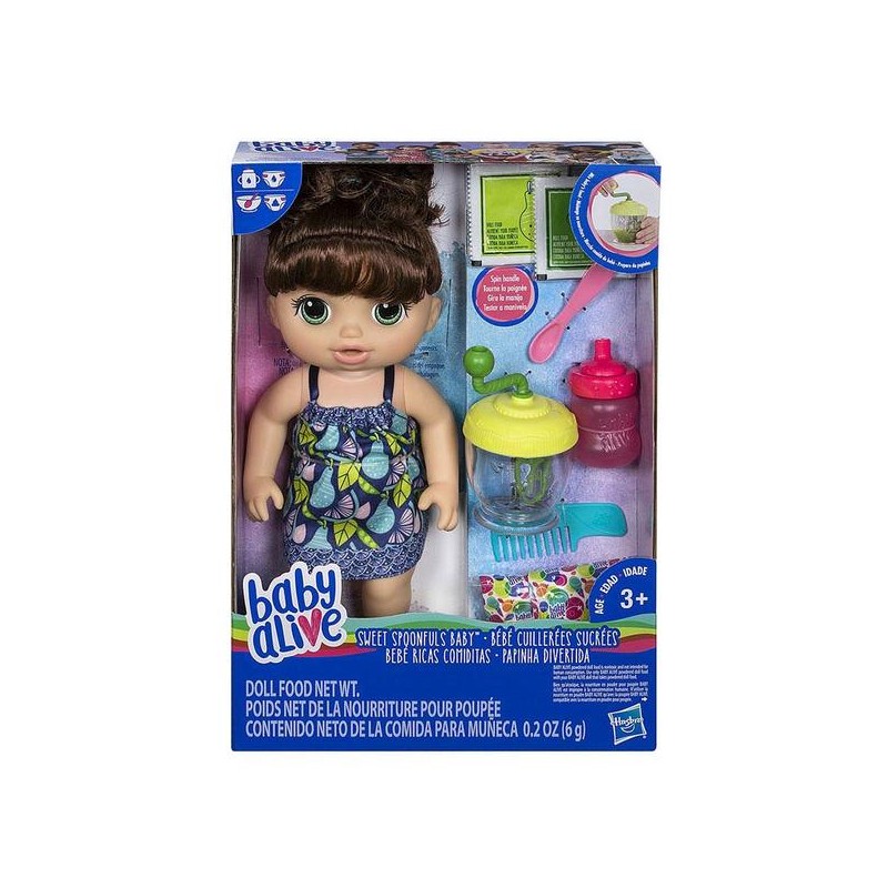 La muñeca bebé Ricas comiditas ofrece a los niños una manera nueva de alimentar a la bebé jugando a prepararle la comida con una batidora especial. A la hora de comer, pon el sobre de comida en la batidora y agrega agua. ¡Los niños pueden girar la manija para mezclar de verdad la comida para la bebé! Después de alimentarla con la cuchara, dale el biberón. Y cuando se "ensucie", cámbiale el pañal. Viene con un peine para hacerle peinados y adorable ropa removible. ¡Juega con tu bebé una y otra vez!