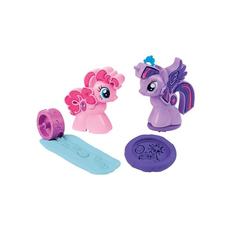 Crea diseños divertidos con estas herramientas de My Little Pony. Haz formas divertidas con el sello Twilight Sparkle. Aplana y corta con el rodillo Pinkie Pie Llena los lados de los ponys para crear marcas Play-Doh.